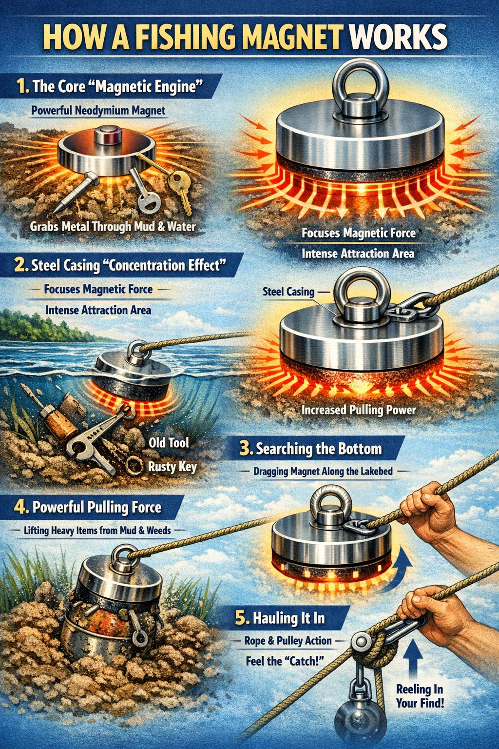 Untuk memahami bagaimana a magnet memancing berfungsi, anda boleh bayangkan ia sebagai "pembersih vakum bawah air" berkuasa besar, kecuali habuk, ia menyedut logam.