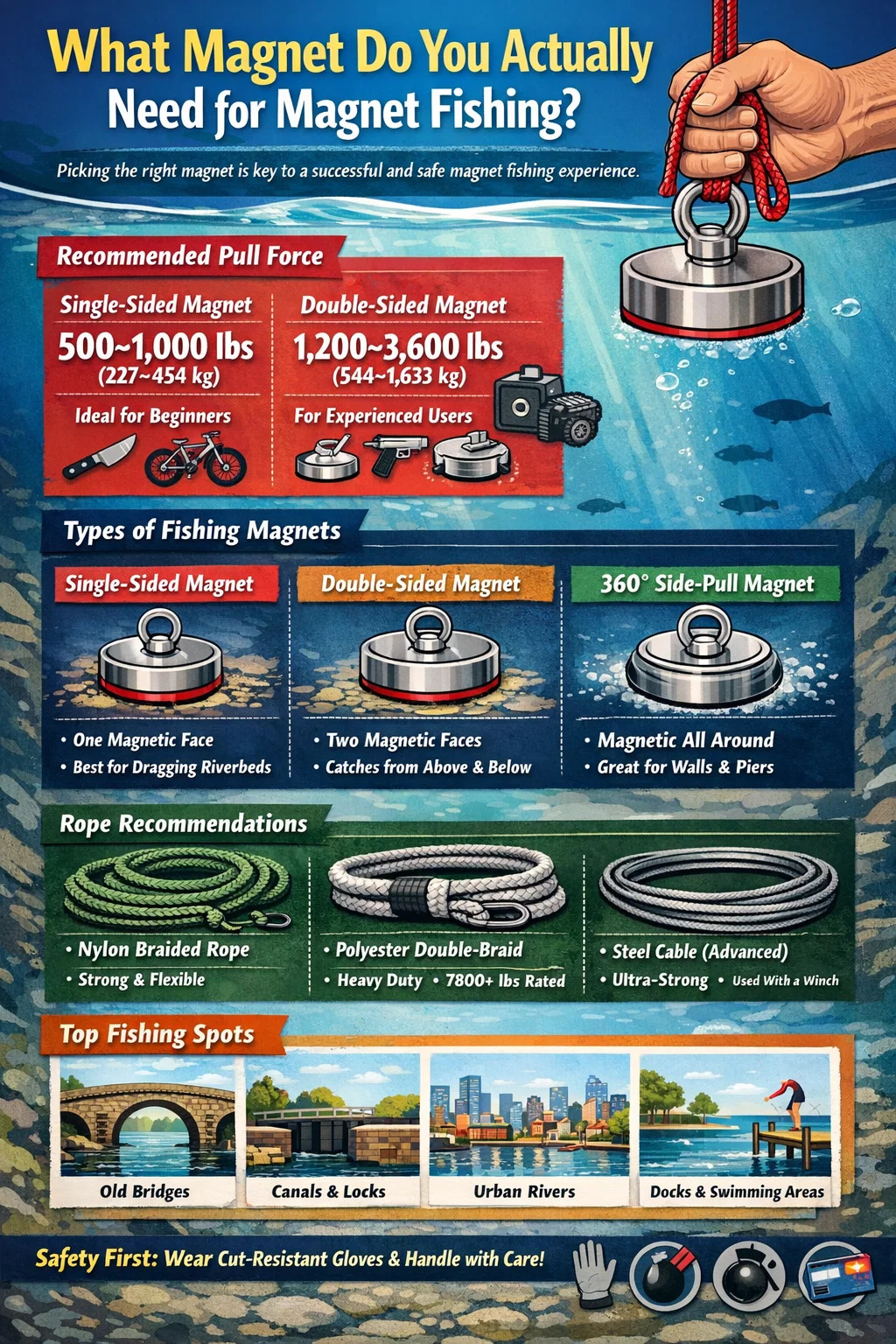 Jawapan ringkas: untuk kebanyakan pemula, a Magnet neodymium satu sisi dengan daya tarik 500–1,000 paun (227–454 kg) adalah titik permulaan yang ideal untuk memancing magnet. Ia cukup kuat untuk mendapatkan pisau, alatan, basikal, dan juga peti besi dari sungai dan tasik, namun cukup terurus untuk dikendalikan dengan selamat tanpa peralatan khusus. Jika anda lebih berpengalaman atau menyasarkan objek yang lebih berat di dalam air dalam, magnet dua sisi dalam julat 1,200–3,600 lb menjadi pilihan yang lebih baik.