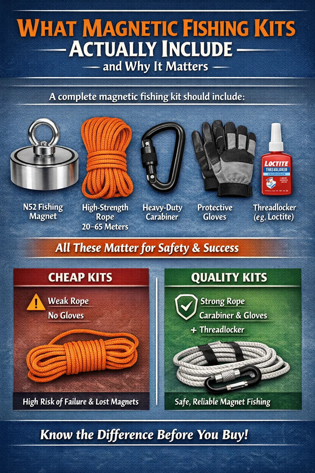 Jika anda sedang mencari jawapan yang mudah: kit memancing magnet lengkap termasuk magnet memancing neodymium, tali tegangan tinggi (biasanya 20–65 meter), carabiner pengunci, sarung tangan pelindung, dan selalunya sebatian pengunci benang seperti Loctite. Komponen ini bersama-sama menentukan sama ada pengalaman memancing magnet anda produktif dan selamat — atau mengecewakan dan berbahaya. Kit murah yang melangkau sarung tangan atau menggunakan tali gred rendah menyumbang sebahagian besar kemalangan dan kehilangan magnet yang dilaporkan dalam komuniti memancing magnet dalam talian.