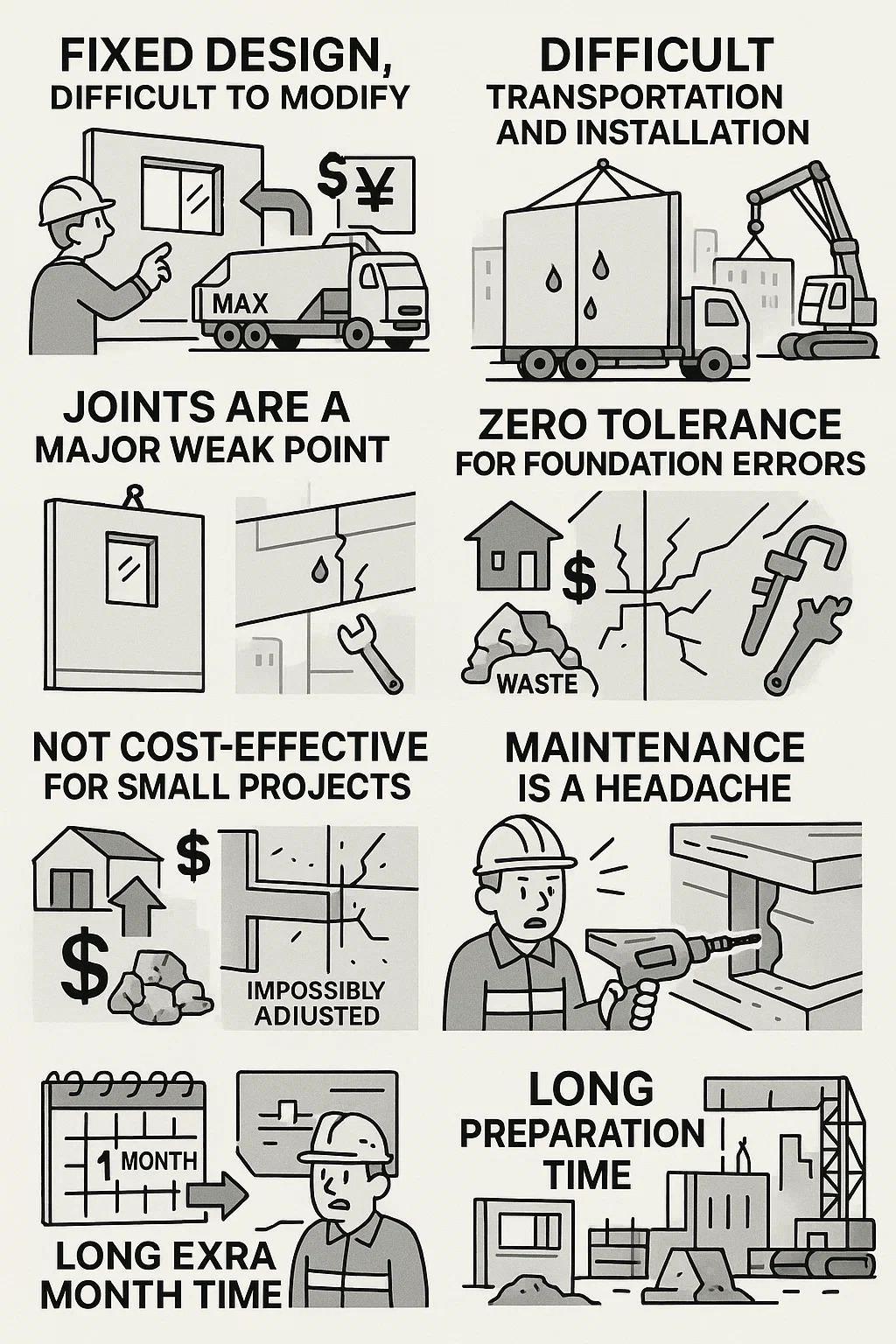 Keterbatasan saiz yang ketat: Saiz maksimum komponen dibatasi oleh kekangan pengangkutan (mis., Trak tidak boleh membawa panel dinding 4 meter), menjadikan bentuk kompleks tidak mungkin.