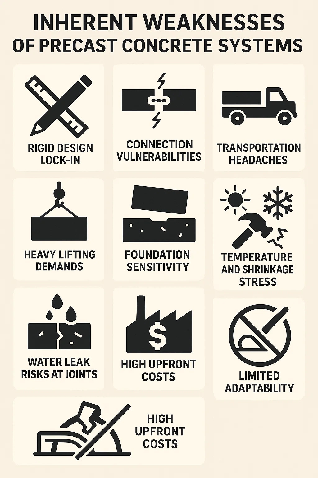 Precast berfungsi dengan buruk untuk reka bentuk yang unik, melengkung, atau kompleks. Laman web yang memerlukan perubahan reka bentuk yang kerap harus mengelakkannya.