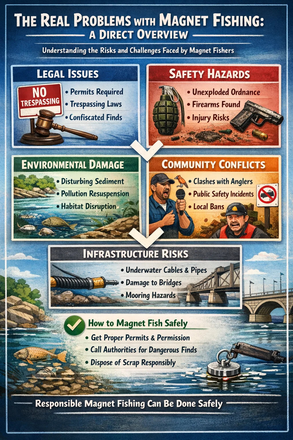 Memancing magnet mempunyai satu set masalah yang tulen - dan mereka lebih serius daripada jangkaan kebanyakan pemula. Hobi ini melibatkan menyeret magnet memancing neodymium yang kuat melalui sungai, terusan, pelabuhan dan tasik untuk mengambil objek logam ferus dari air. Pada permukaannya ia kelihatan seperti aktiviti luar yang tidak berbahaya, dan dalam banyak cara ia adalah. Tetapi masalah yang datang dengannya merangkumi pendedahan undang-undang, bahaya fizikal, bahaya alam sekitar, risiko keselamatan awam dan konflik komuniti. Tiada masalah ini adalah hipotesis — semuanya telah mengakibatkan kecederaan, penangkapan, denda dan larangan awam di beberapa negara.