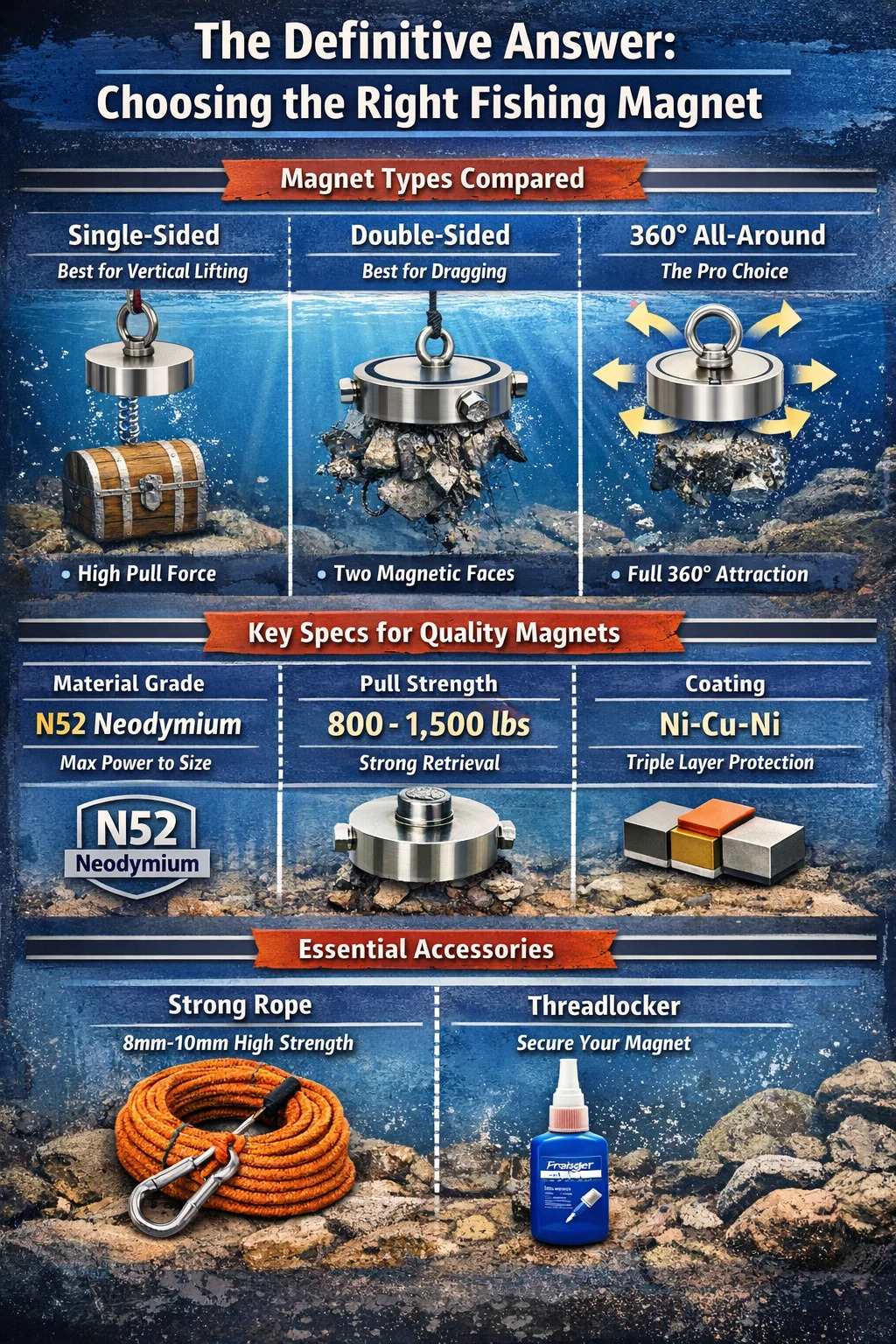 The Magnet Neodymium 360 darjah secara meluas dianggap sebagai pilihan terbaik untuk peminat yang serius kerana ia menawarkan tarikan magnet dari setiap sudut, dengan ketara meningkatkan peluang tangkapan. Bagi pemula, a magnet memancing dua belah memberikan keseimbangan terbaik antara kos, berat dan keberkesanan. Bahan teras mestilah sentiasa Neodymium (NdFeB) , khususnya gred N52, kerana ia menyediakan nisbah kuasa kepada saiz tertinggi yang terdapat dalam teknologi moden.